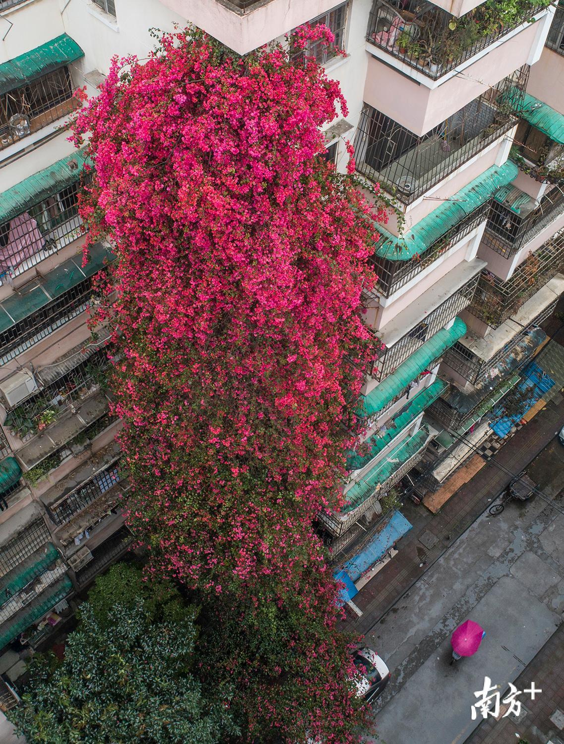 白云区云苑新村,一株20年九层楼高的簕杜鹃,花开如瀑布般倾泻下来。