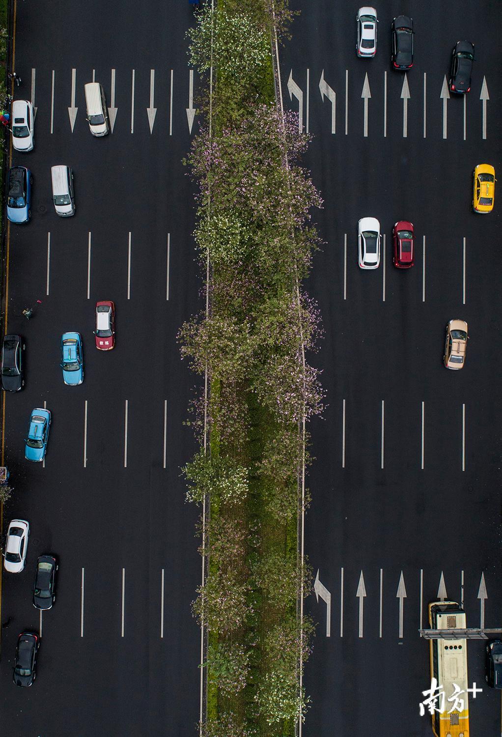 白云区齐心路的中央,紫荆花绽放。