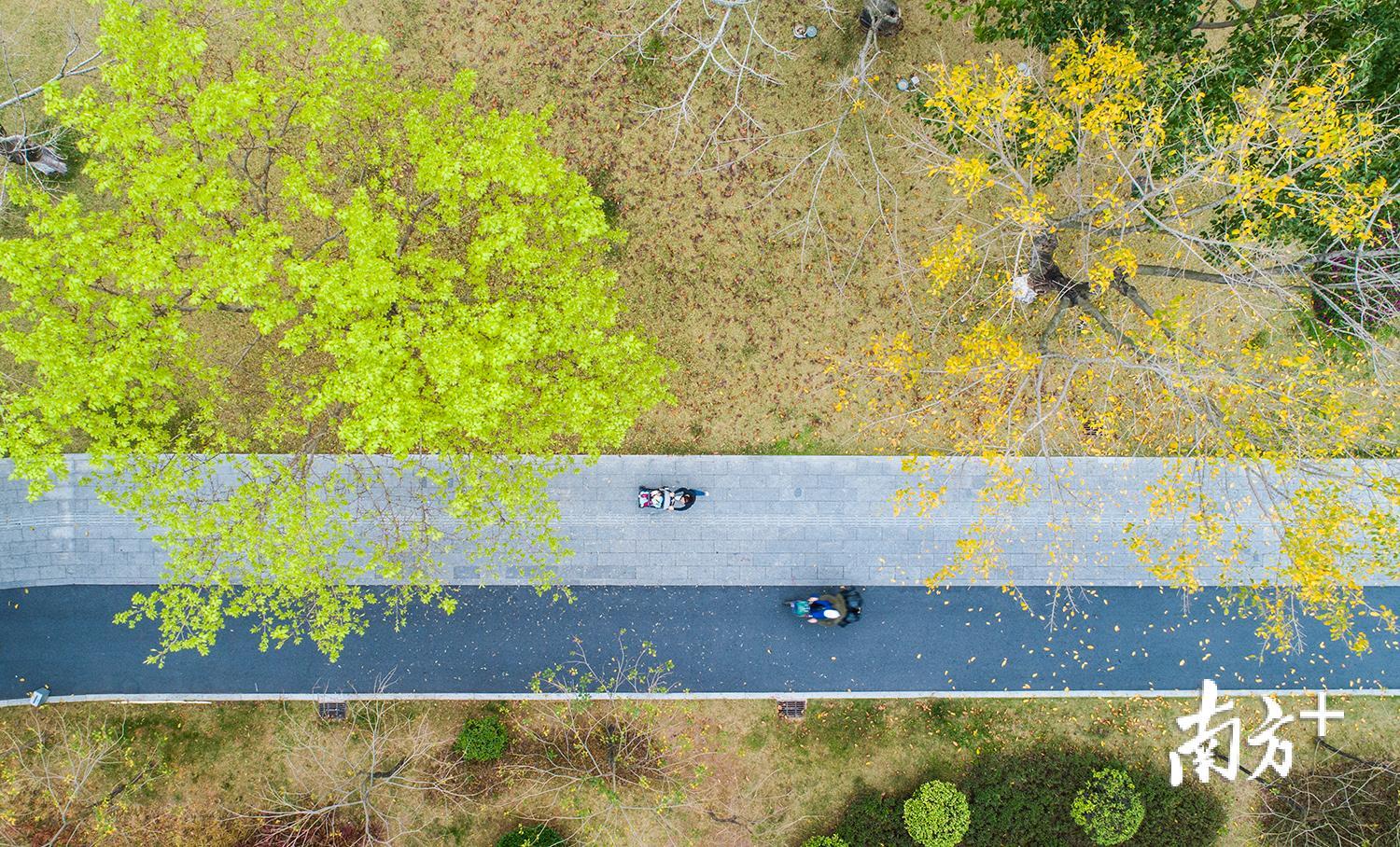 临江大道,一棵树木满是绿芽,另一棵则满树枯叶,人们穿行在树下。