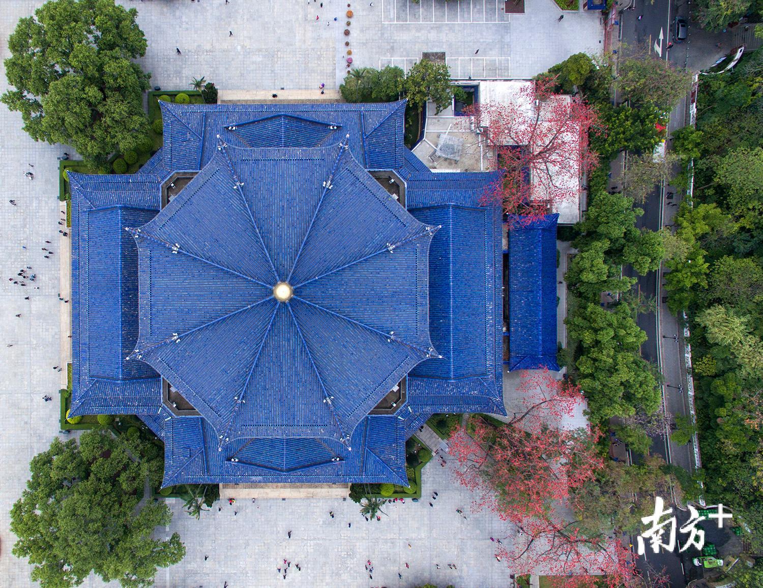 两株木棉树与气势恢宏的八角形宫殿建筑的中山纪念堂相互辉映。