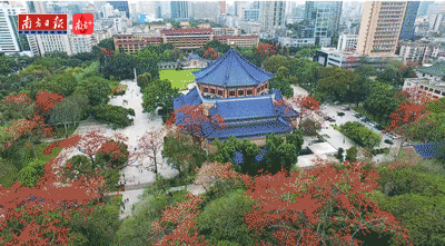 中山纪念堂周围,木棉树齐齐绽放花朵,一株高达26米据悉已超过300年树龄的木棉树,与气势恢宏的八角形宫殿建筑相互辉映,吸引众多游客。