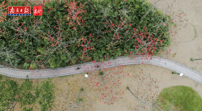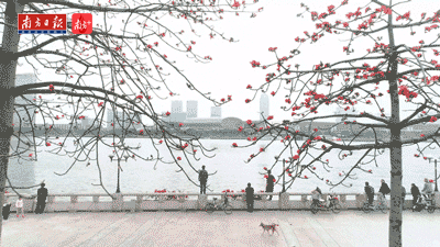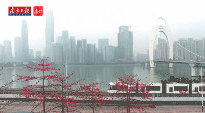 阅江西路上。车厢印着红棉图案的有轨列车经过开满红棉的树木,仿佛像是一列开向春天的列车。