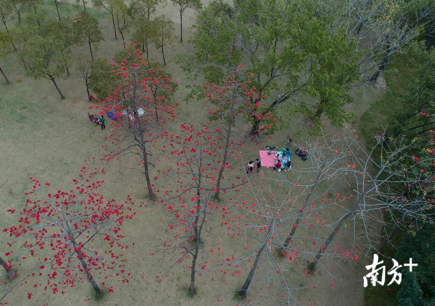滨江公园里,木棉树下野餐的人们。