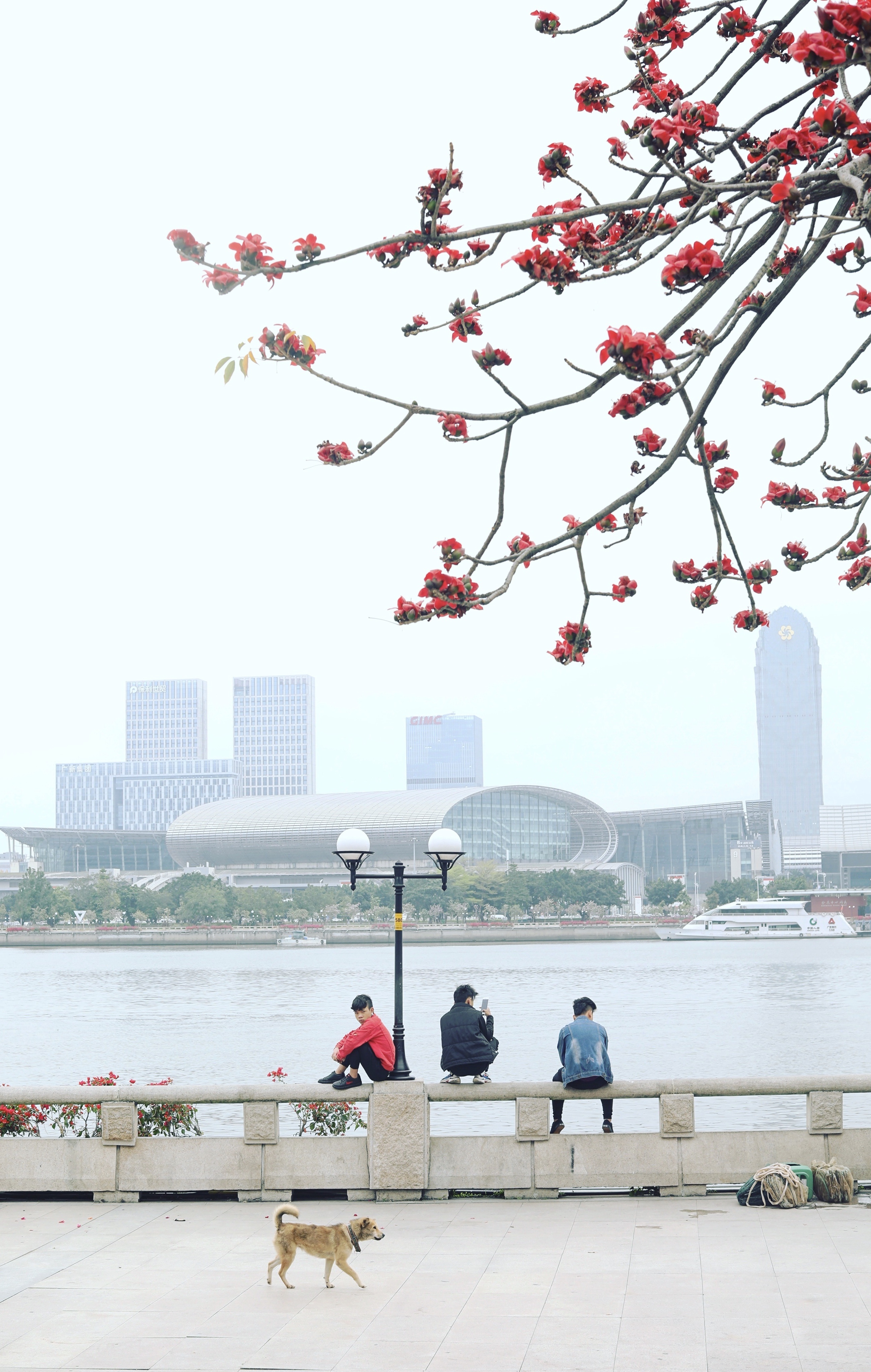 临江大道上,人们在珠江边垂钓、散步,河畔木棉花优雅地绽放着,对岸是琶洲会展中心。