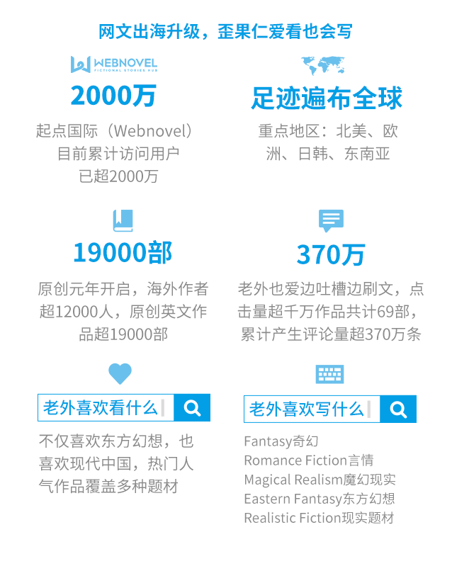 作为网文出海重要策源地,阅文集团旗下海外门户起点国际(Webnovel)足迹已遍布全球,累计访问用户超2000万。基于今年四月海外原创功能的开放,截至目前海外作者已超12000人,共审核上线原创英文作品19000余部。围绕原创作家、精品内容、IP开发,阅文集团正加速在全球进行商业模式的探索和创新,期望以网络文学为载体撬动中国泛娱乐产业的出海和扩张。