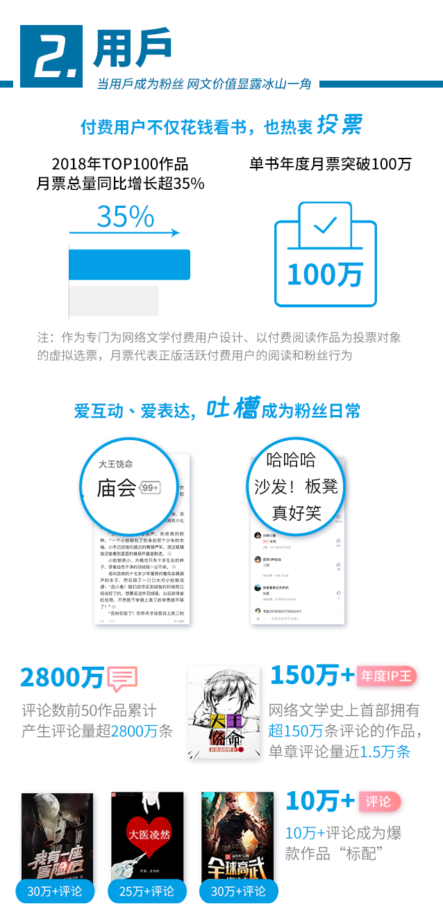 2018年,阅文集团TOP100作品月票总量同比增长超35%,单书年度月票首次突破100万大关。作为专门为网络文学付费用户设计、以付费阅读作品为投票对象的虚拟选票,月票直接体现了用户的阅读和粉丝行为。同时,拥有“盟主”这一网文圈专属粉丝称号的人群数量达到历年最高(“盟主”指在起点中文网等平台上,单本作品消费1000元人民币及以上的粉丝)。