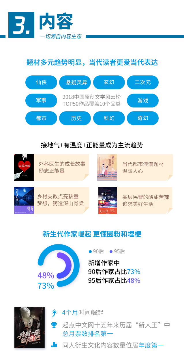在作者层面,越来越多的90后、95后新锐作家在写作平台上脱颖而出,为网络文学的“逆龄发展”带来驱动力。阅文集团2018年新增作家群体中,90后作家占比超七成,95后作家占比近五成。与年轻读者群体在年龄层和价值观上的契合,使得他们更懂“圈粉”和“埋梗”,在维持粉丝粘性和个人热度上也更有优势。