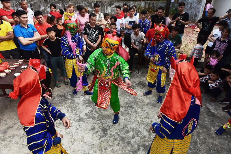 简朴威武、原始粗犷、豪放有力……3月3日,在雷州市松竹镇东阁村,一名名“特殊演员”戴着面具,在喧闹的锣鼓声和鞭炮的轰响下,挥膀舞臂展拳脚,到家家户户门前翩翩起舞……这是该村一年一度举行的傩舞民俗活动表演。