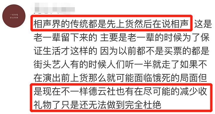 现场德云女孩也解释了,首先“先上货”是相声行当老一辈传下来的规矩,并不是德云社首创,师父郭德纲在开场前也收过礼物签过字的。