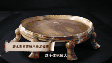 比如这个体积硕大、造型奇特的唐代八兽足青釉砚,八只粗壮的兽腿承托起一个直径达35.5厘米的圆形砚盘,气势恢弘。砚身的开片青绿釉则绽放出莹润的光泽,方便书画家润笔蘸墨,既实用又别致。