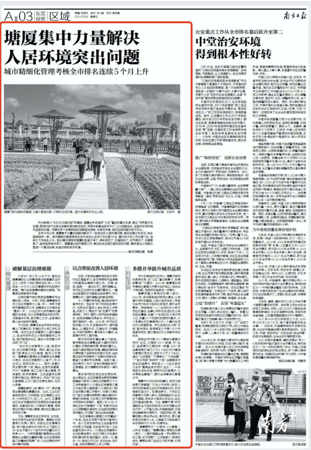 去年9月以来,塘厦集中力量在短期内解决了一批突出的人居环境问题,推动全镇卫生状况、城乡面貌焕然一新。城市精细化管理考核在全市排名从去年9月份第31名,攀升到今年2月份第7名,连续5个月排名上升。群众真切感受到塘厦的街道干净了、停车规范了、交通有序了、空气更好了、环境更美了,越来越有城市味了。塘厦通过城市管理工作,解决社会治理方面的实际问题,最终是为人民群众营造一个整洁优美、和谐文明的城市环境。