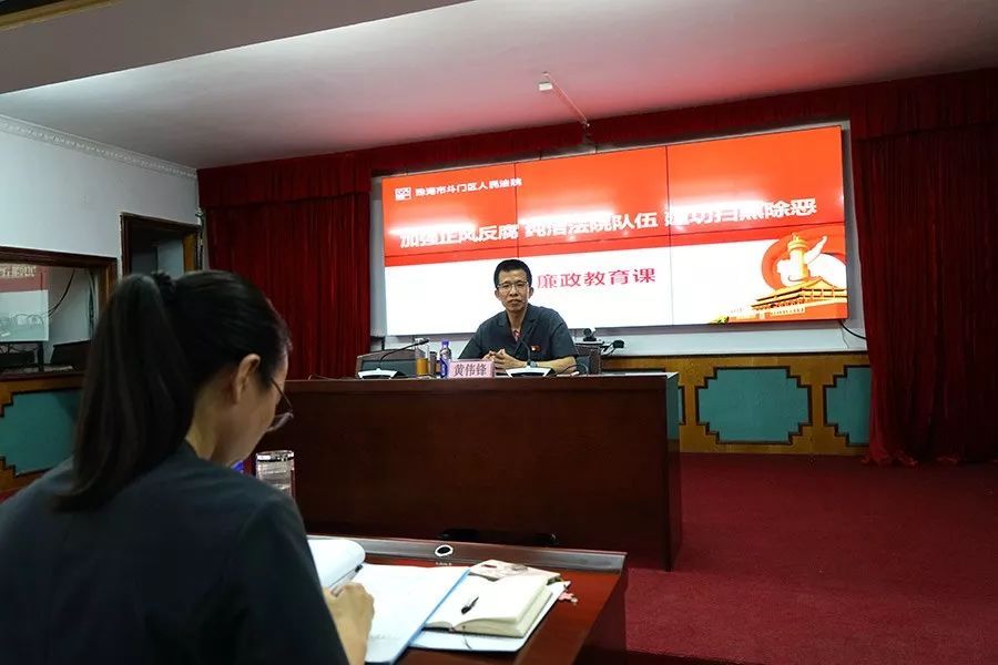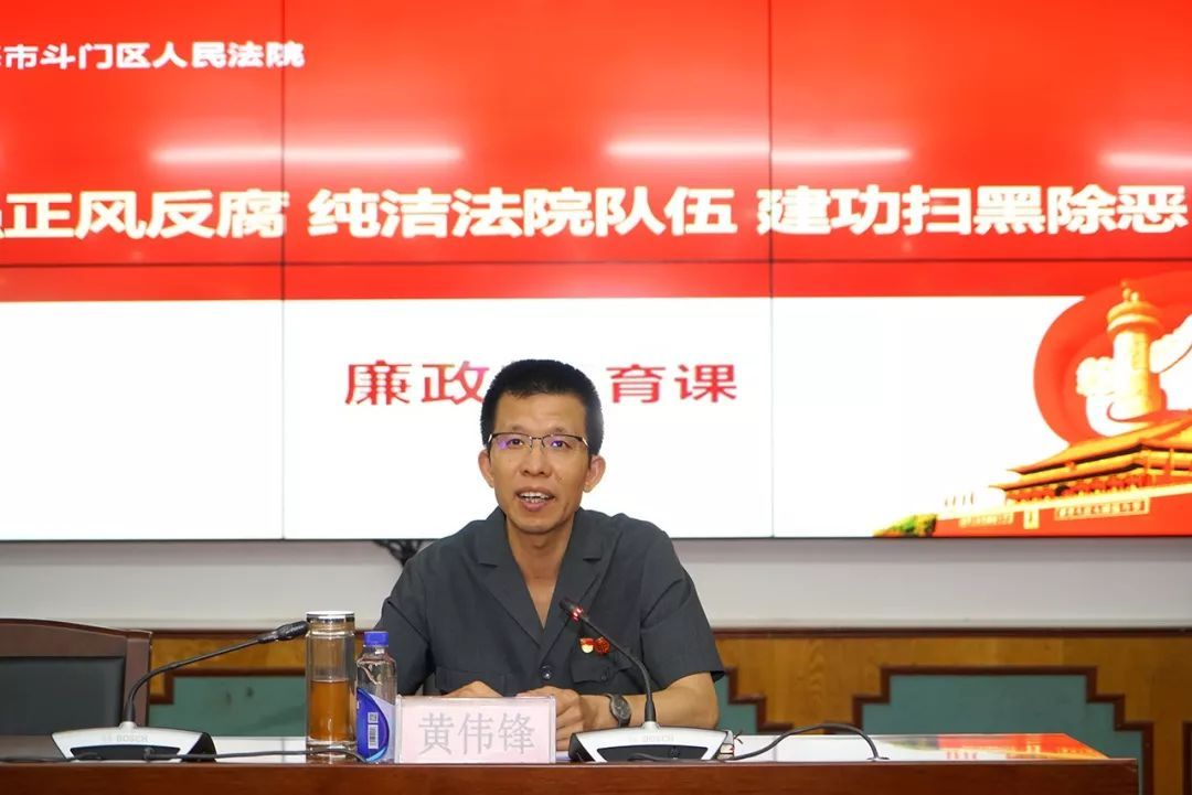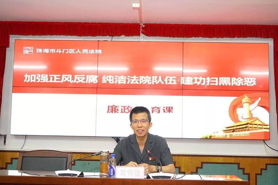 观影后,斗门法院党组书记、院长黄伟锋以“加强正风反腐 纯洁法院队伍 建功扫黑除恶”为主题,用大量的数据和真实的案例,从纯洁法院队伍的重要性、当前正风反腐中存在的问题、自觉守纪律讲规矩知敬畏等三个方面给全院同志上了一堂生动的廉政教育课。