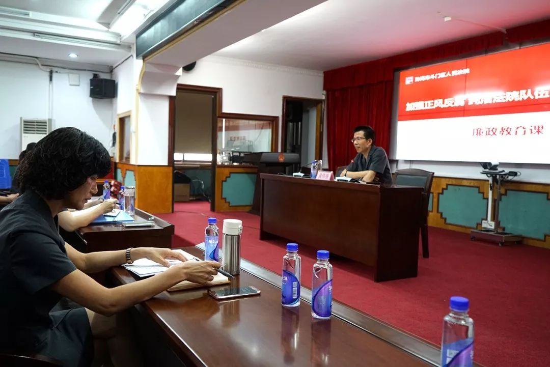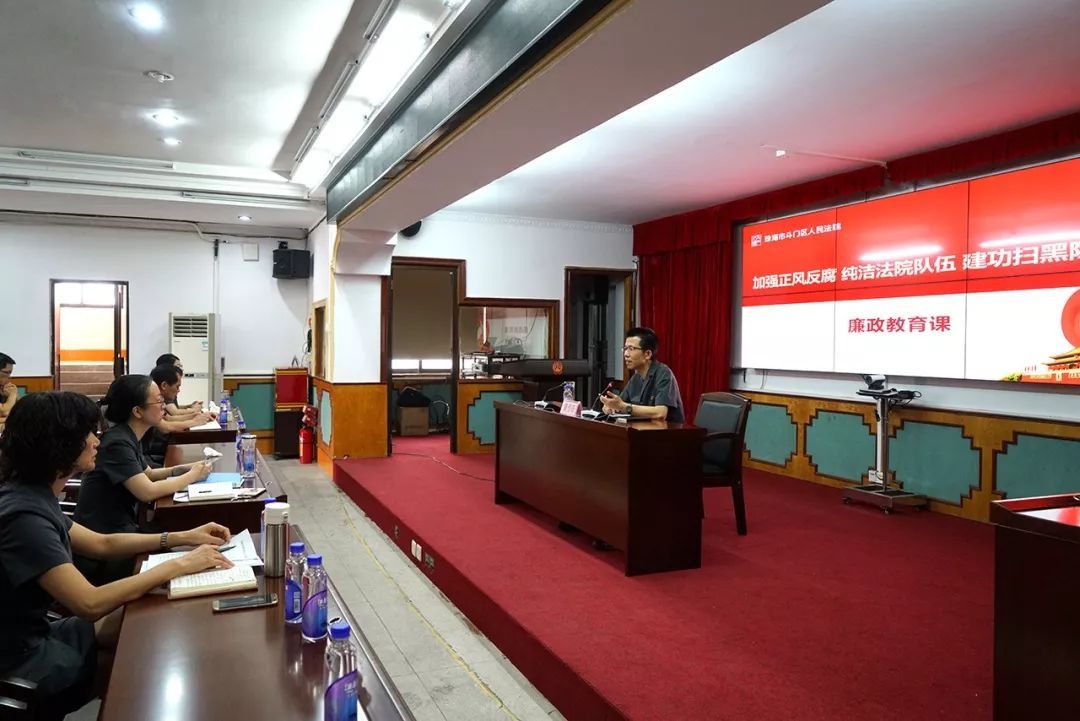 根据斗门法院2018年纪律教育学习月活动实施方案,结合“纯洁政法队伍、建功扫黑除恶”主题警示教育活动,9月29日下午,斗门法院召开全院大会,通过观看警示教育片、党组书记为斗门法院全院同志上廉政课的方式,集中开展廉政警示教育活动。
