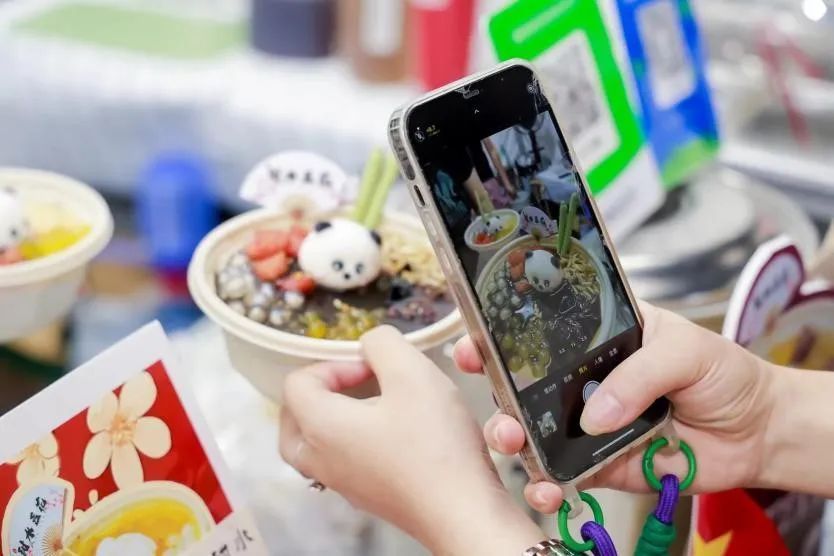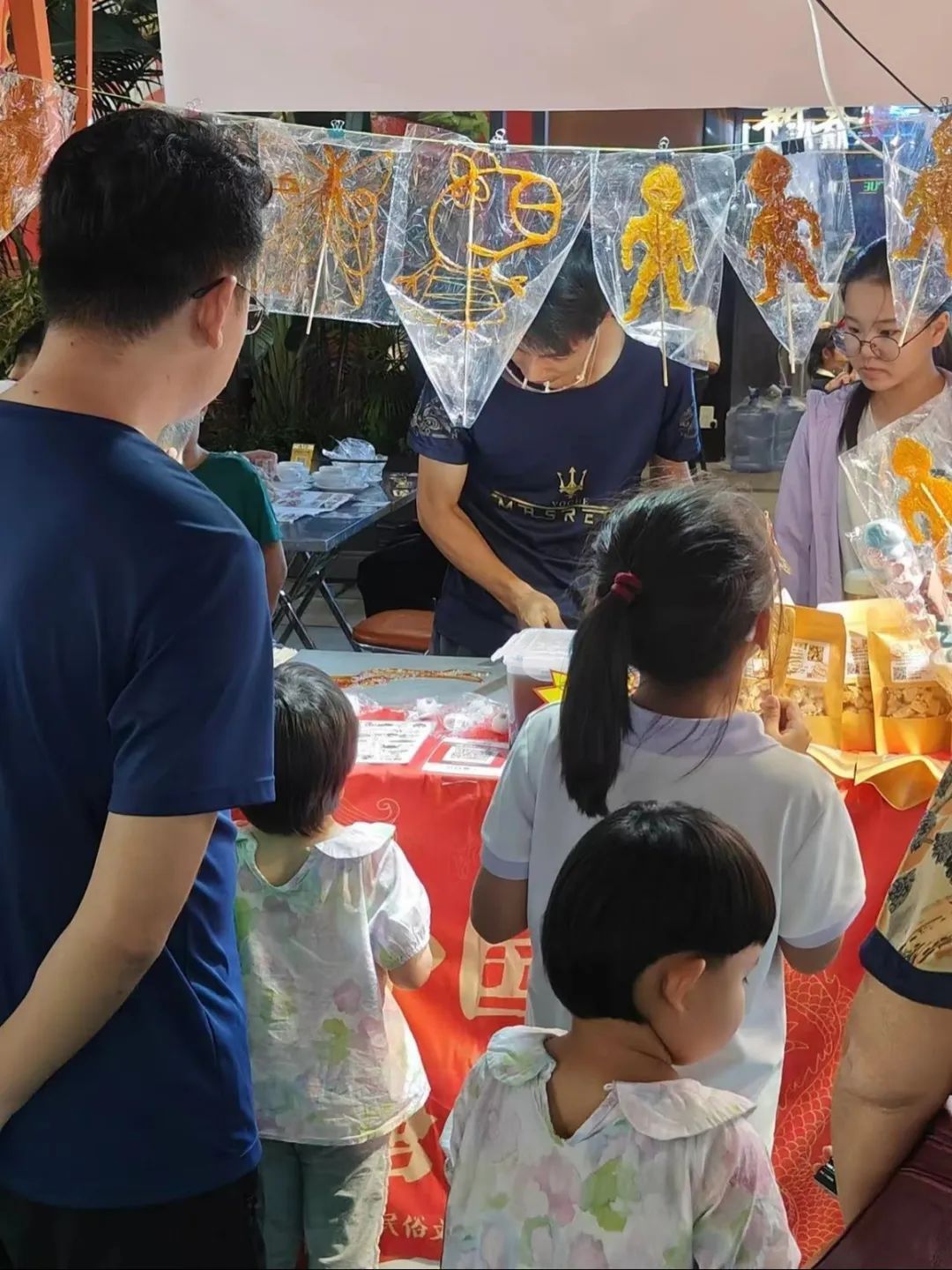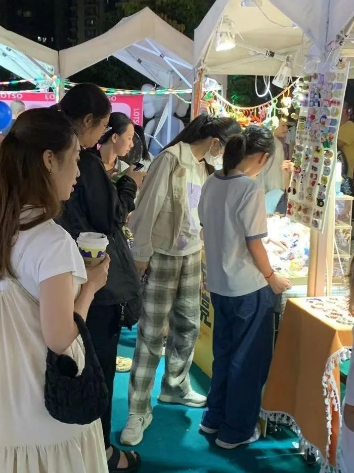 而在舞台的另一旁,夜间市集也热热闹闹地开张了。套圈、捞金鱼、夹娃娃……五花八门的趣味游戏颇受小朋友的青睐;香水、美甲、手链……琳琅满目的手作摊位则吸引了消费者的目光;糖画、冰糖葫芦等传统小吃,也抚慰着人们的味蕾。