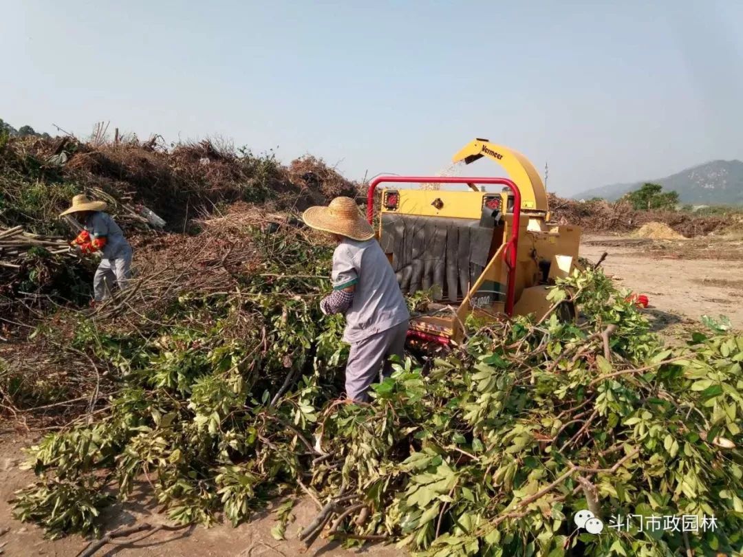 为解决园林绿化废弃处理问题,斗门园林绿化所从2015年引进了树叶树枝粉碎机,通过机械粉碎,将树叶、树枝这类需要运至填埋场填埋的园林垃圾变成树苗的天然养分,既节约了园林垃圾的运输处理成本,又免费获取绿植的天然养分,这样的创新,值得点赞哦
