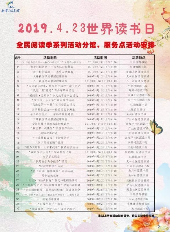 此外,为了方便读者朋友们在家门口参加本季系列活动,金湾区图书馆在两镇分馆及各村居漂流书屋举办32场活动,包括健康讲座、书法比赛、绘本故事分享会等活动。让读者朋友在家门口感受浓浓书香之乐。