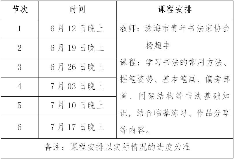 以毛笔书法基础知识为学习内容,开展6节课(课程免费)。书法用纸与墨水由组织方提供,毛笔与砚台等学习材料由学员自备或组团购买。因名额有限,为保证课程质量,请本人确保出勤率高于70%。