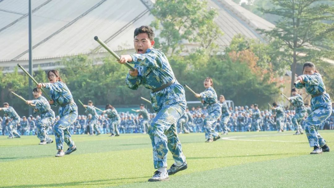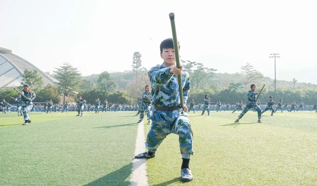 大会在升国旗,奏唱国歌仪式中庄严开幕。随后,唱校歌,由军训学生护送校旗入场。最震撼人心的是军训成果汇报表演,表演方阵分为基本队列动作、刺杀操、擒敌术、应急棍、匕首操五个科目,由来自各连排的同学混编而成。他们喊着响亮的口号依次跑步震撼入场,整个过程刚劲有力、整齐划一、斗志昂扬,赢得现场师生的阵阵掌声和喝彩。