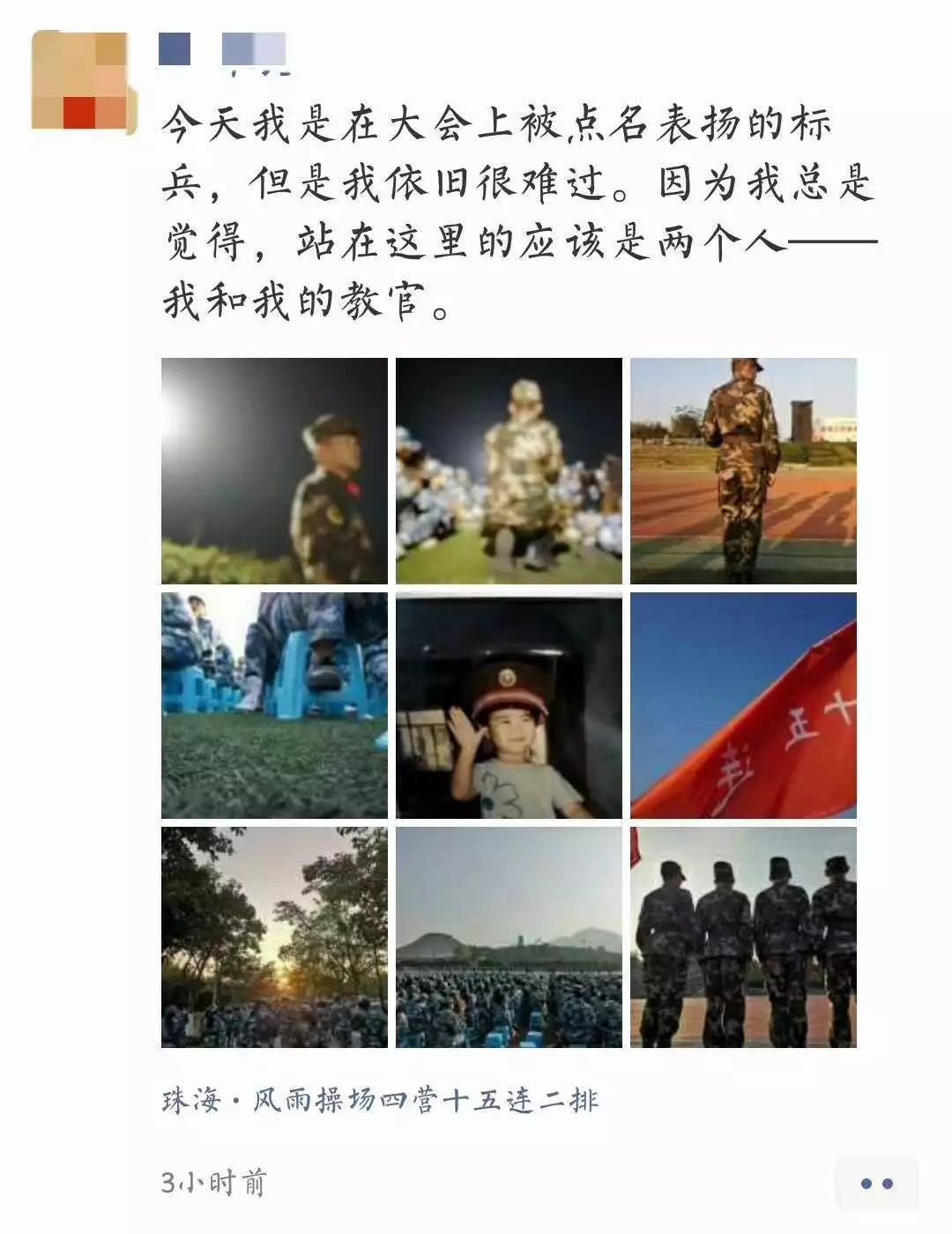正如风展红旗是蓝天里最美的风景,保家卫国亦是他们最美的模样。今日军训,我当同样。血还是热的,在流淌;心还是活的,在胸膛。我当尽一切努力,向军人的坚韧,军人的承担,军人的大爱看齐。在军训后的未来,我当以己之任担国之责。