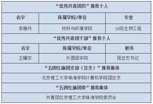 根据共青团珠海市委员会下发的《关于推报2018-2019年度“广东省优秀共青团员、团干部”和“广东省五四红旗团委(团支部)”等先进个人和集体的通知》,经校团委组织评选,分别选出了一名“优秀共青团员”推荐个人,一名“优秀共青团干部”推荐个人、一个“五四红旗团支部(总支)”推荐集体以及“五四红旗团委”推荐集体,现将候选人(团队)名单予以公示。