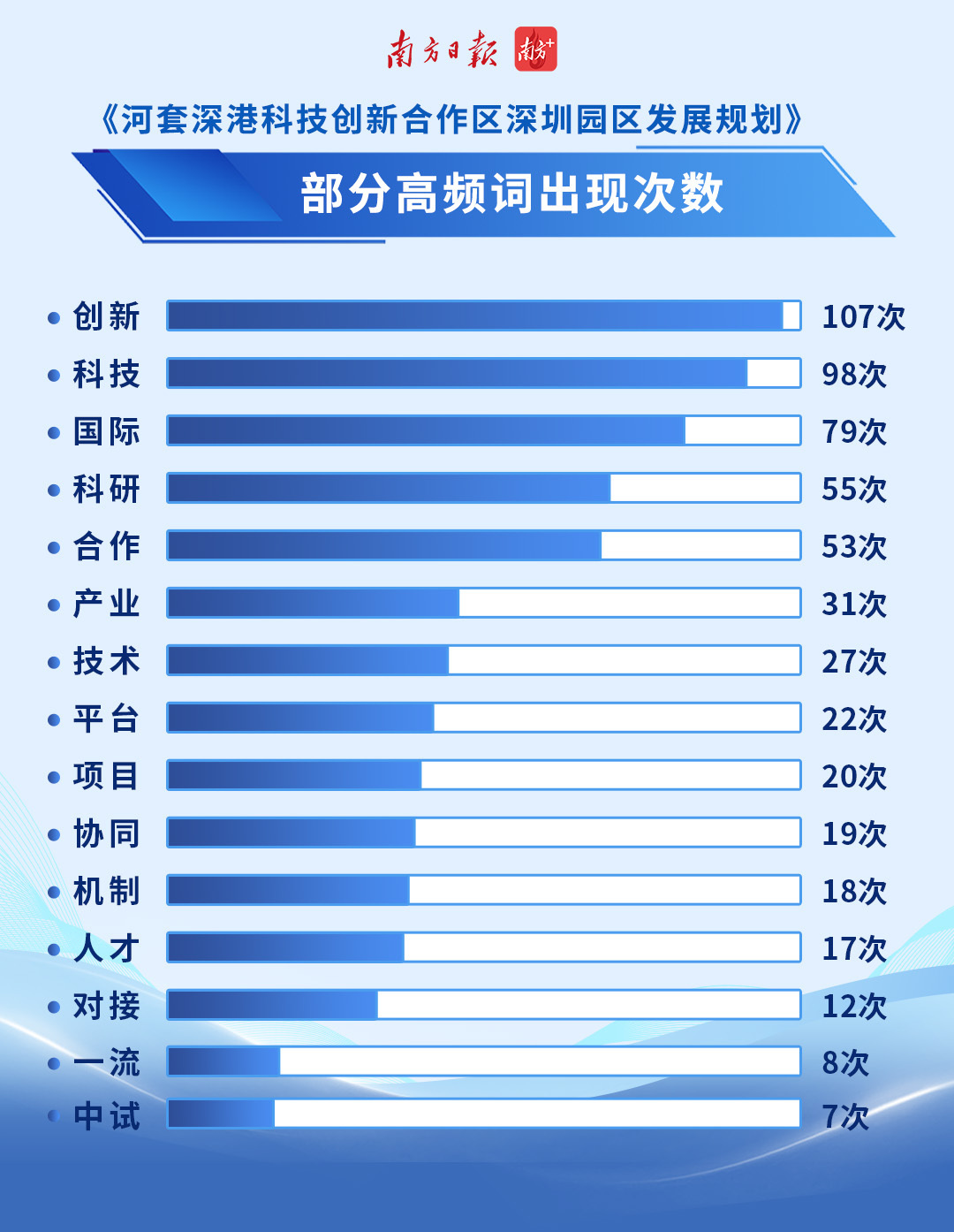 其中提到创新107次、科技98次、科研55次、技术27次,都远远高于横琴、前海、南沙3个方案中出现的次数。