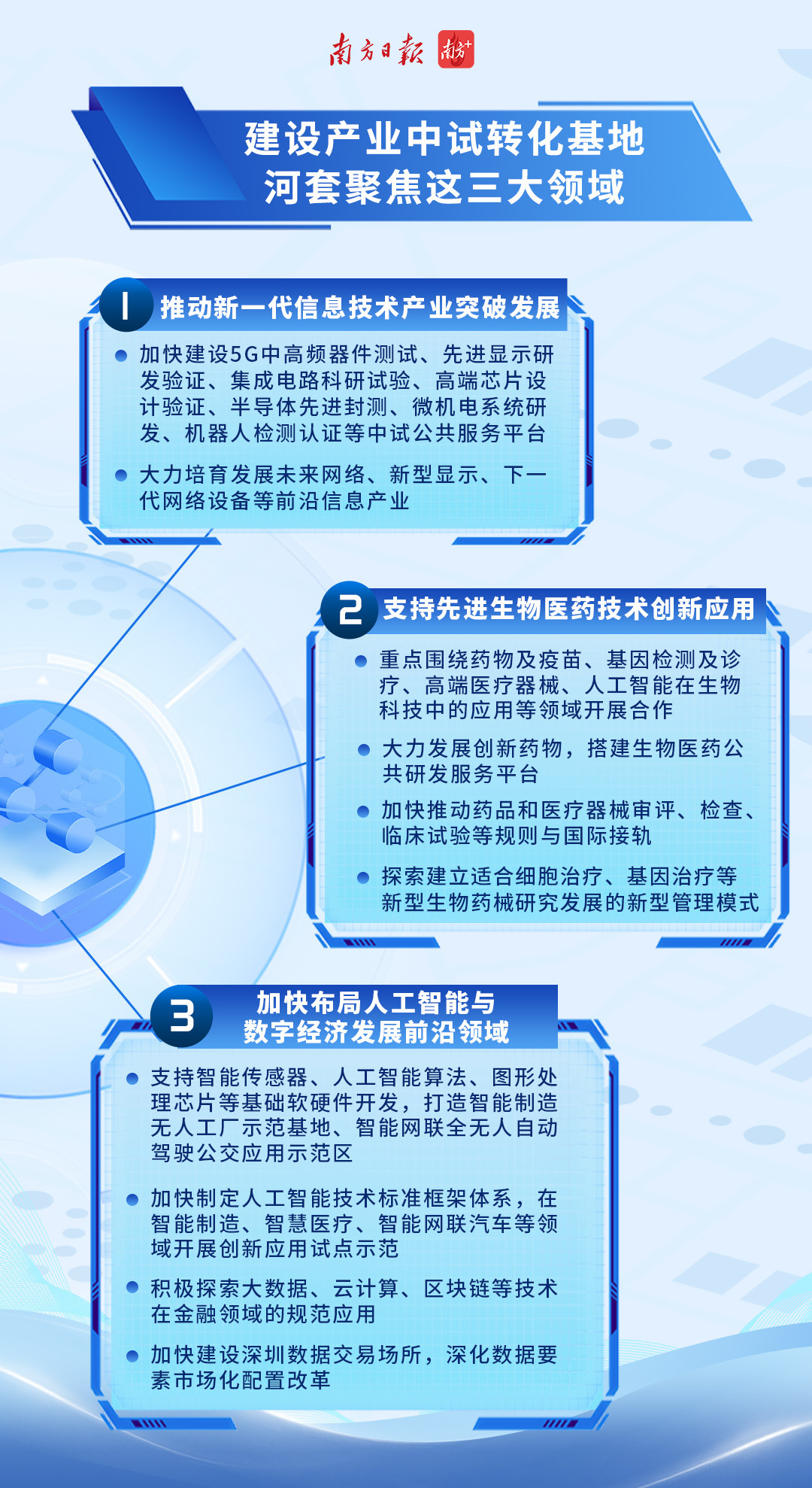 科技创新涉及基础研究、技术攻关、成果产业化等众多环节。为此,深圳园区将建设具有国际竞争力的产业中试转化基地,把新一代信息技术、生物医药、人工智能与数字经济作为中试转化的重中之重。