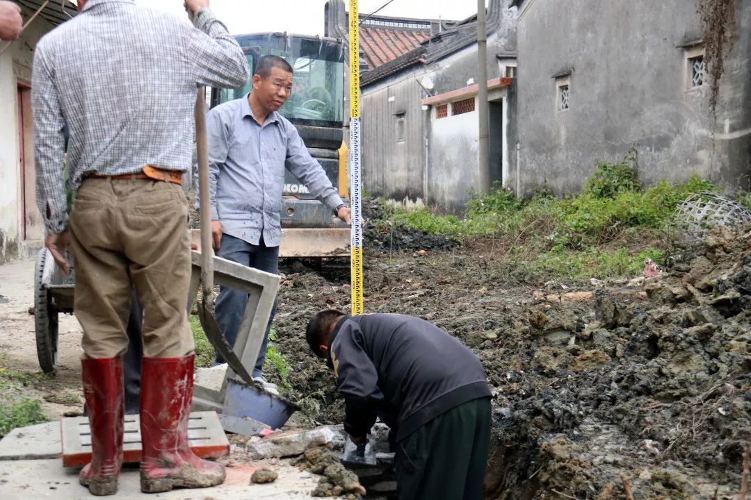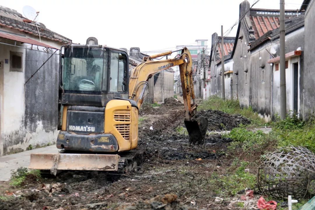 在莲青村老四片区,一台小型挖掘机和几名工人正在铺设污水管道及建造污水井。据介绍,该村准备建设这样的污水管道近7000米,将各家各户每天产生的生活污水收集汇入截污干管,再输送到峡山污水处理厂作无害化处理,预计工期3个半月。