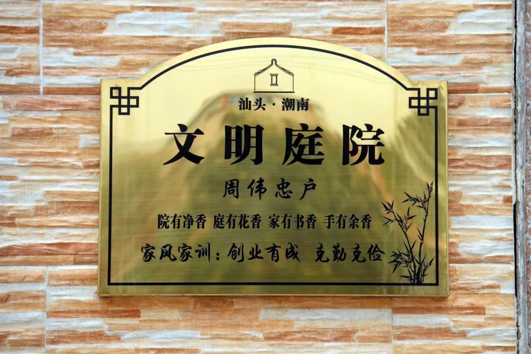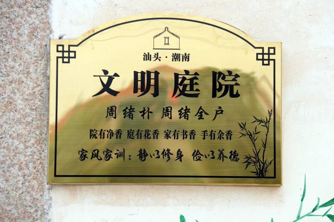 我们来到位于峡山街道泗联社区西宅公园旁的传统下山虎民居群时已近正午,这里便是潮南区首个“文明庭院”创建点,每户人家门口悬挂的金色牌匾上那句“院有净香、庭有花香、家有书香、手有余香”以及各自的家风家训,很好地诠释了“文明庭院”的内涵。