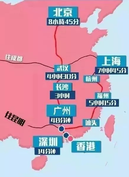 广深港高铁香港段开通运营后,可通达北京、上海、石家庄、郑州、武汉、长沙、杭州、南昌、福州、厦门、汕头、贵阳、桂林、昆明等城市,到达内地40多个车站,将大大拉近香港与内地城市间的时空距离。其中,潮汕站每天将开行5对往返西九龙的始发终到列车,分别为G6381/G6282、G6383/G6384、G6385/G6386、G6387/G6388、G6389/G6390,从潮汕站到西九龙,仅需要3个小时左右。记者查询获悉,潮阳站、潮汕站、饶平站至香港西九龙站二等座票价分别为人民币172元、182元、196元。