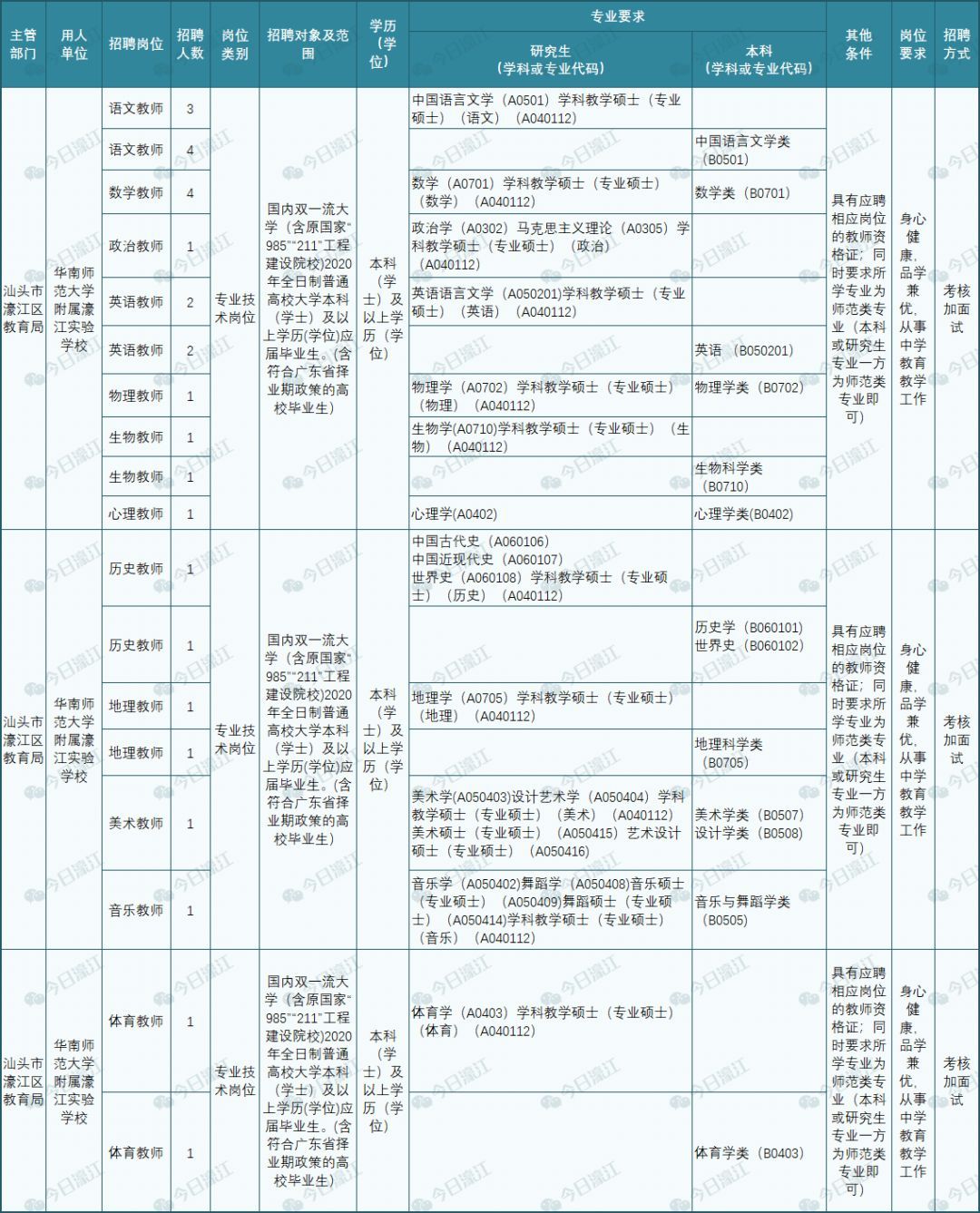 根据《广东省事业单位公开招聘人员办法》(省政府令第139号)、《汕头市事业单位公开招聘人员实施细则(暂行)》(汕市人〔2009〕269号)和《汕头市事业单位公开招聘紧缺人才有关问题的实施细则》(汕人社〔2019〕143号)等有关规定,因华南师范大学附属濠江实验学校发展和教学工作需要,汕头市濠江区教育局拟到高校现场设点公开招聘2020年全日制普通高校大学本科(学士)及以上学历(学位)应届毕业生,现就本次招聘有关事项公告如下。