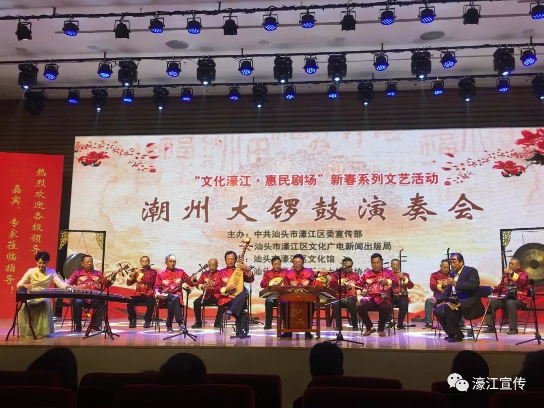 12月30日晚上,由汕头市濠江区委宣传部、濠江区文广新局主办,濠江区文化馆承办的“文化濠江·惠民剧场”新春系列文艺活动——潮州大锣鼓专场演奏会在新落成启用的濠江区文化馆新馆举办。