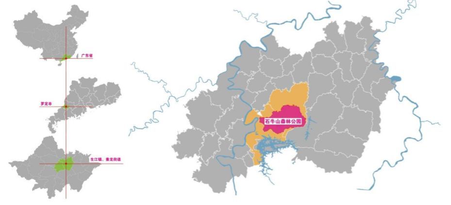 公园位于罗定市的生江镇及素龙街道交界处的大榄村及碗窑村,在罗定中心城区的南侧。拟建的罗定市石牛山生态(森林)公园位于罗定市生江镇和素龙街道境内,东至白泥坑水库,南至金银湖湿地公园,西至碗窑村,北至石牛山北面山脚。