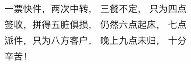 :是人都不易,快递行业的底层从业人员更是不易,那不是一般的难,是很难很难很难的…… 他表面上是因为丢了快递而哭,实质是哭自干快递行业以来的所有委屈、所有不公、所有不顺、所有的所有辛酸…… 快递发展了这么些年,一直没有一部写快递员生活的书或电影或电视剧,那怕微电影,都没有……