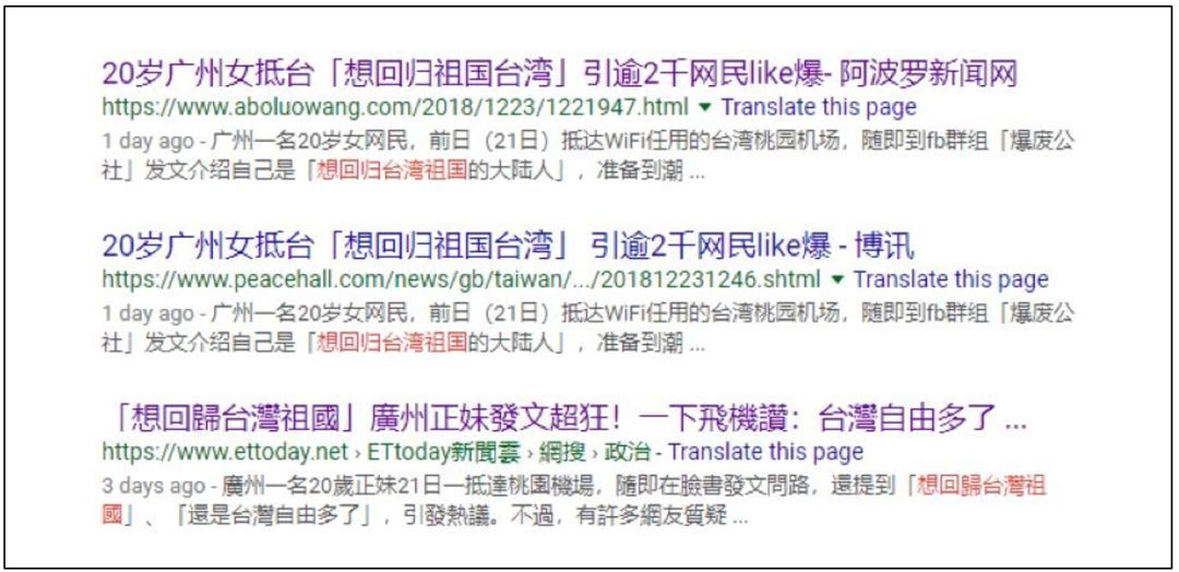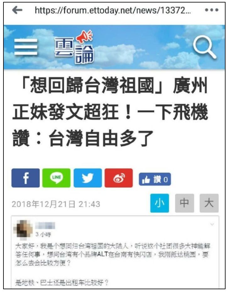 事情是这样的:几天前,台湾的《自由时报》、ETToday新闻云、TVBS新闻网等多家台湾媒体突然开始纷纷宣称,一个来自大陆的女子在某境外社交网站上发帖称台湾才是她“想回归的祖国”,并称该女子还说台湾非常自由,而在大陆生活则时时处在监视之下,所以她想要“台湾国籍”。