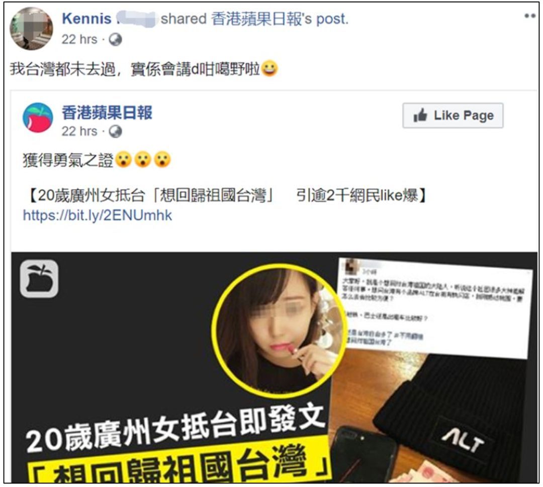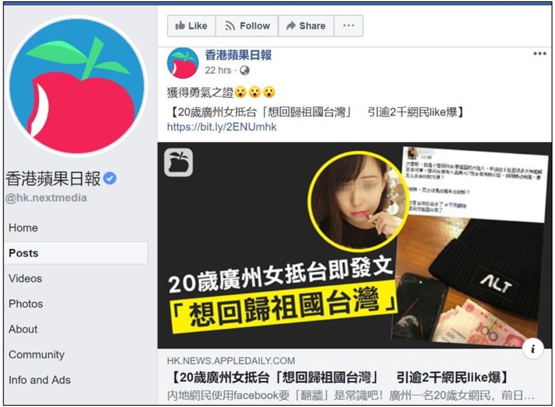 而一贯在香港煽动“港独”,在台湾又煽动“台独”的《苹果日报》更是在看到这条新闻后兴奋地宣称:这大陆女子真有“勇气”。