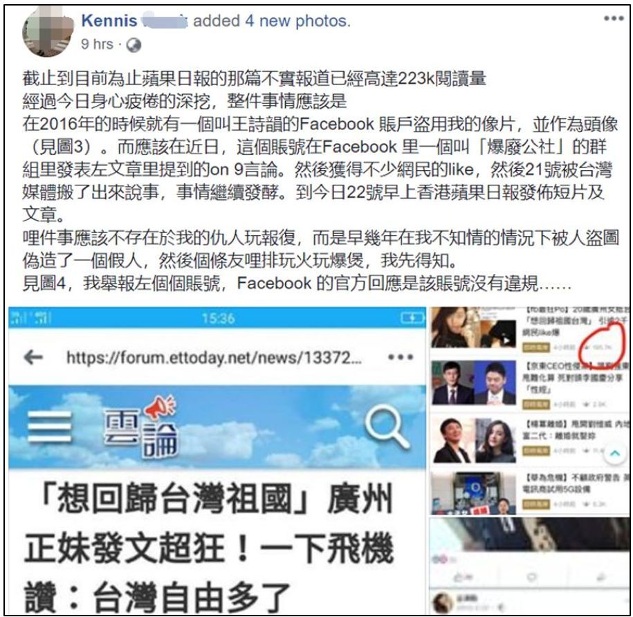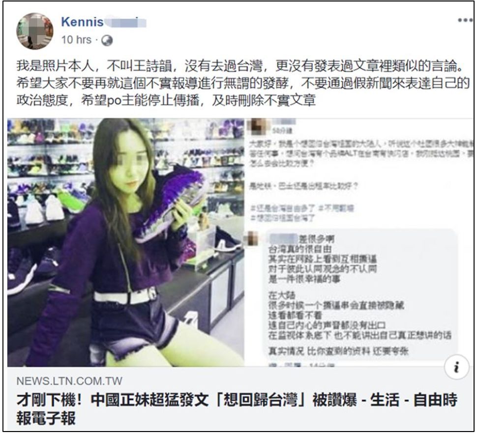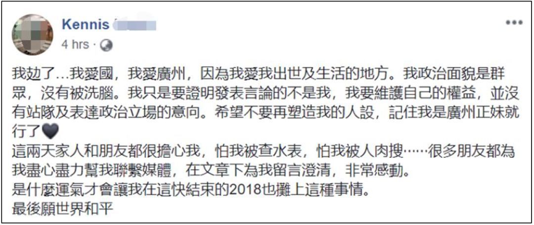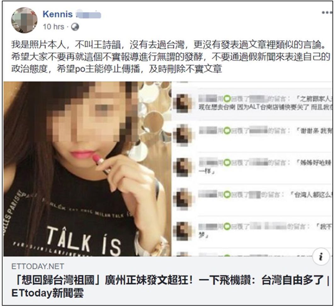 根据郭女士的说法,她根本就没去过台湾,而那个冒充她的“王诗韵”则从郭女士的其他社交账号上盗用了大量她的照片。郭女士还表示爱国和爱广州的她也根本不会写出那些被港台媒体拿去“意淫”的言论。她还干脆在《苹果日报》的评论板块留言,斥责了这些港台媒体为了“无脑反中”就编造【假新闻】的可耻行径。