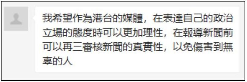 “我希望作为港台的媒体,在表达自己的政治立场的态度时可以更加理性,在报导新闻前可以再三审核新闻的真实性,以免伤害到无辜的人。”
