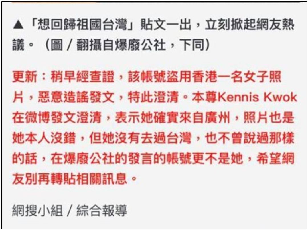 目前,虽然在郭女士的持续维权下,这些港台媒体终于在他们的报道中加入了一小段澄清的内容,称之前那个宣称“要回归祖国台湾”的账号是假冒他人,这些媒体却并没有删除他们错误的报道并公开向郭女士道歉,没有有效消除给郭女士造成的不良影响。