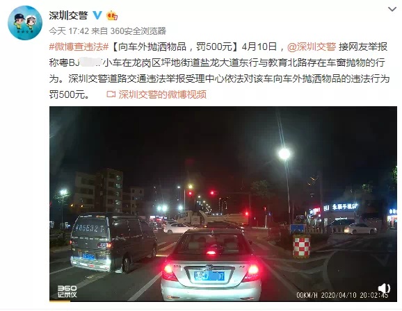 近日,@深圳交警接网友举报称粤B小车在龙岗区坪地街道盐龙大道东行与教育北路存在车窗抛物的行为,深圳交警道路交通违法举报受理中心依法对该车向车外抛洒物品的违法行为罚500元。