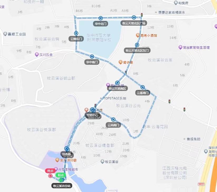 牧云溪谷总站、缇香郡、营销中心、云尚南门、云峯南门、华中南门、云锦东门、华中北门、牧云天地北区广场、牧云天地北区东门、牧云天地南区、营销中心、缇香郡、牧云溪谷总站