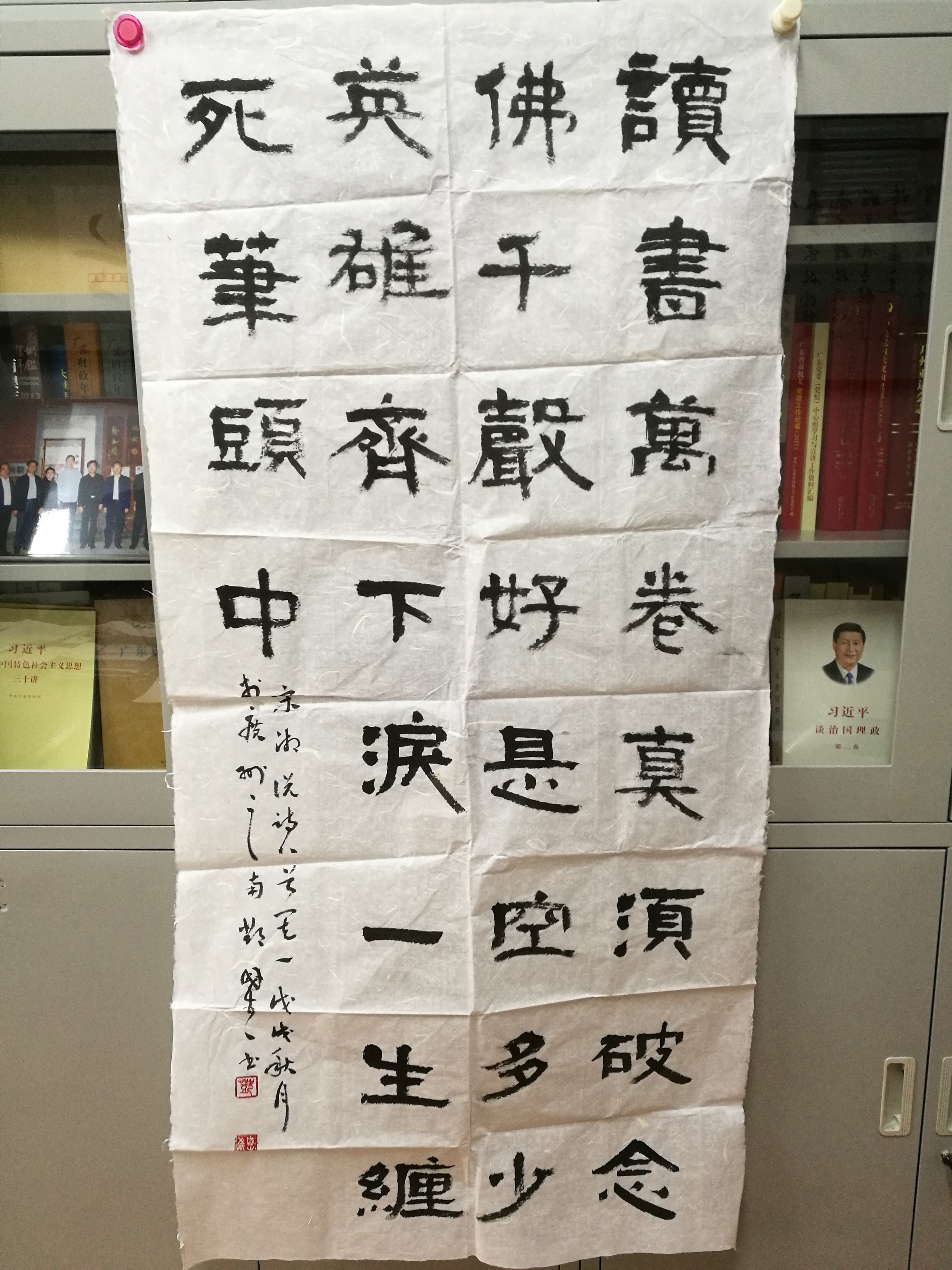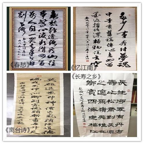 在这些书法作品中不乏名家大师力作,比如:著名书法家李海老师创作藏头妙诗《长寿之乡》:“长生何处有丹方,寿比松乔到长潭。之适蕉岭英雄在,乡宾四海恋梅江。”并亲自挥毫赠与蕉岭仓海诗廊;著名书法家乔平大师书写的丘成桐诗词一首《忆江南》:“多少事,尽付梦魂中,幸有旧稿传心意,书留墨迹哲语浓,格物说玄空。” 书法大家吴俊明书写的晚清爱国诗人、教育家、抗日保台志士丘逢甲诗一首《春愁》:“春愁难遣强看山,往事惊心泪欲潸。四百万人同一哭,去年今日割台湾”;清华大学博士后、国内职称最高的书法家吴晓懿老师书写的丘逢甲《离台诗》一首:“英雄退步即神仙,火气消除道德编;我不神仙聊剑侠,仇头斩尽再升天。”