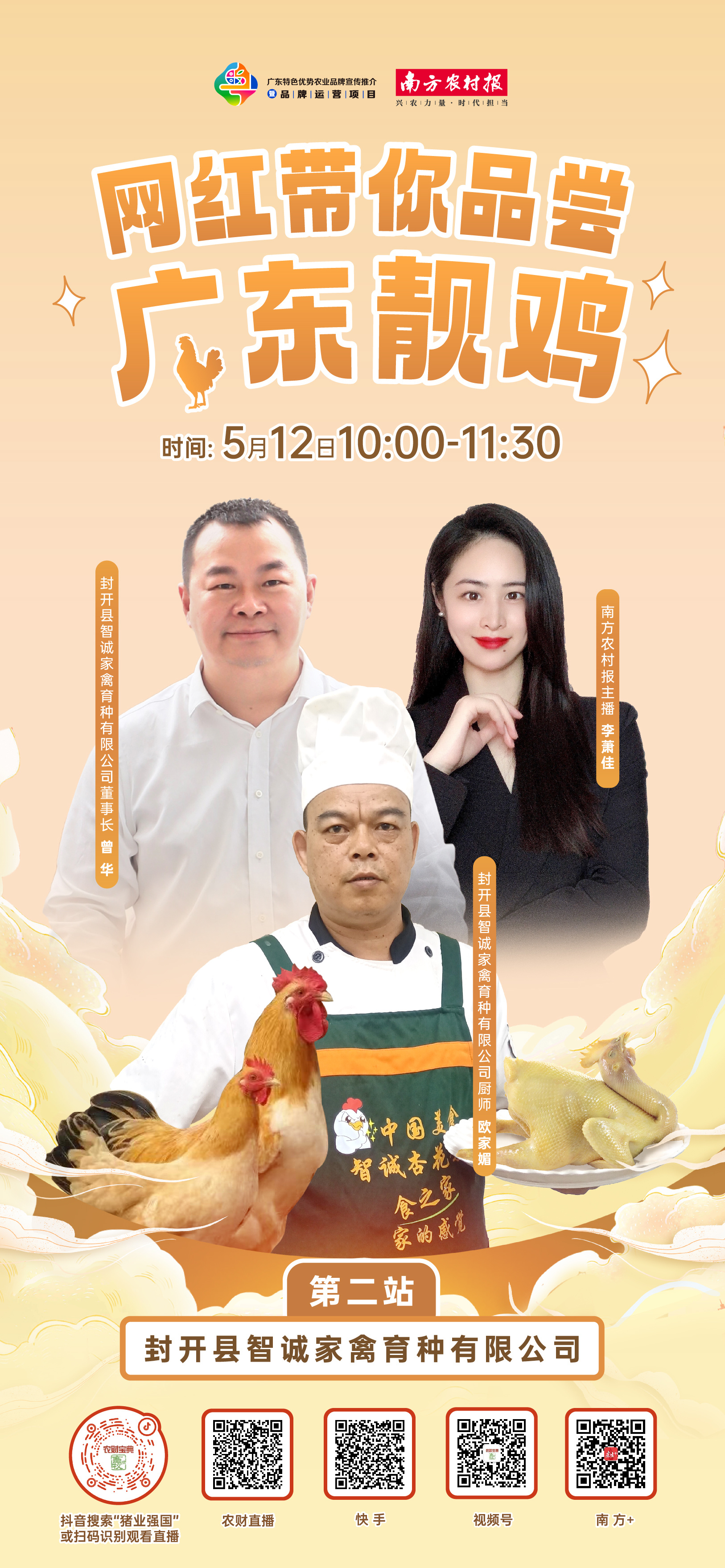 杏花鸡的味道到底如何,自己在家可以如何烹饪?5月12日10:00-11:30,“网红带你品尝广东靓鸡”直播活动走进智诚家禽,智诚家禽董事长曾华将带网友现场直击封开杏花鸡的养殖过程,学习烹饪杏花鸡的简易菜式——隔水蒸鸡、电饭煲焗鸡,品“玻璃皮、蔗渣骨”,敬请期待。