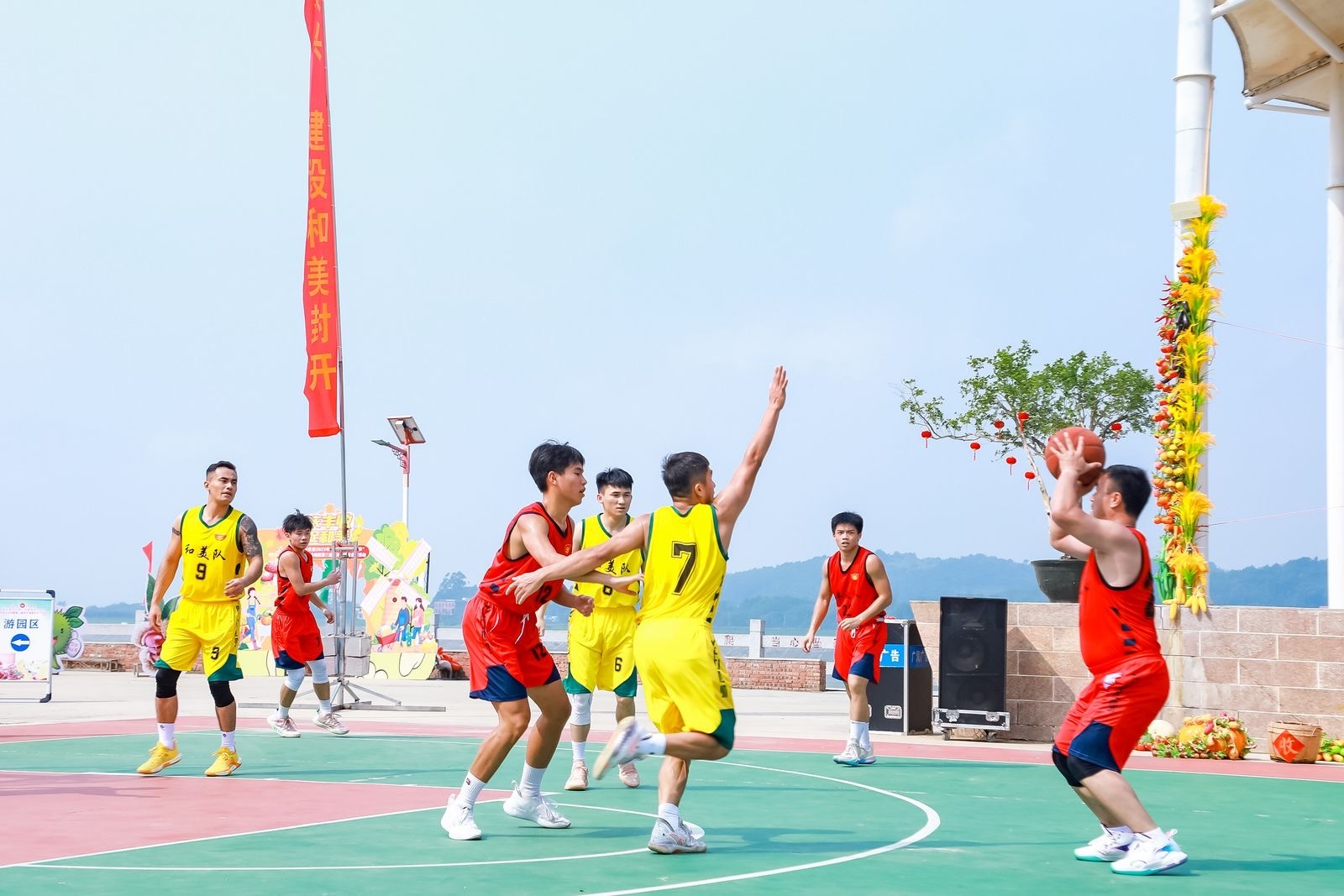 “加油!加油!”一声声呐喊响彻封开县长岗镇文体广场上空。篮球场上竞逐激烈,一个个精彩进球引得观众高声欢呼。场下游人也玩得不亦乐乎,剥栗子,比手速,套圈套鸡比准度,绞尽脑汁猜灯谜,趣味多多,其乐融融。在美食品鉴展位前,观众还能一饱口福。