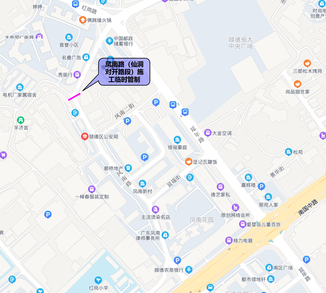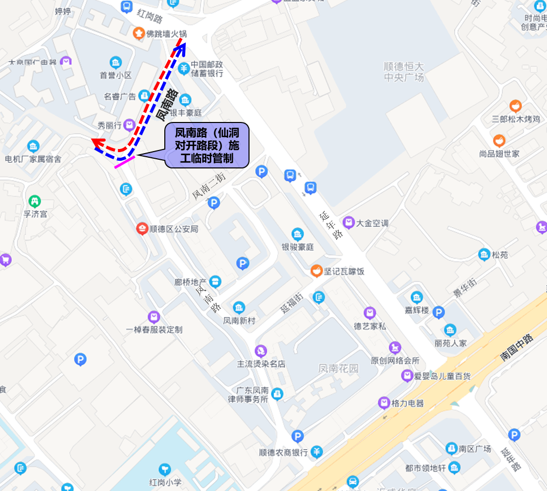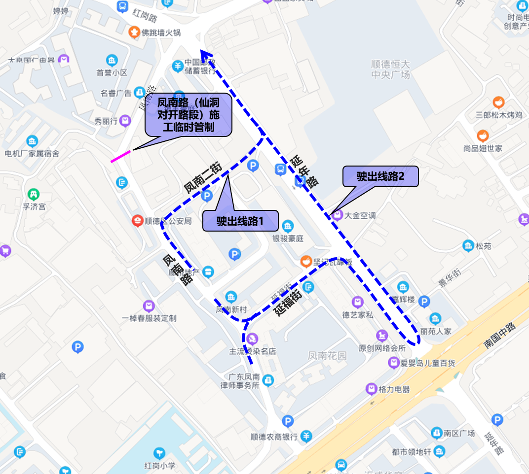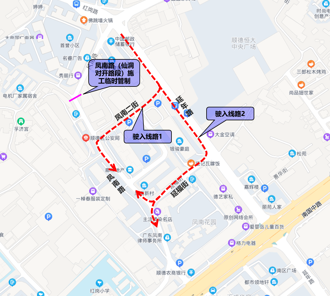 2.顺德公安局、人民法院工作及办事人员与周边片区居民请沿延年路→凤南二街→凤南路或延年路→延福街→凤南路绕行。