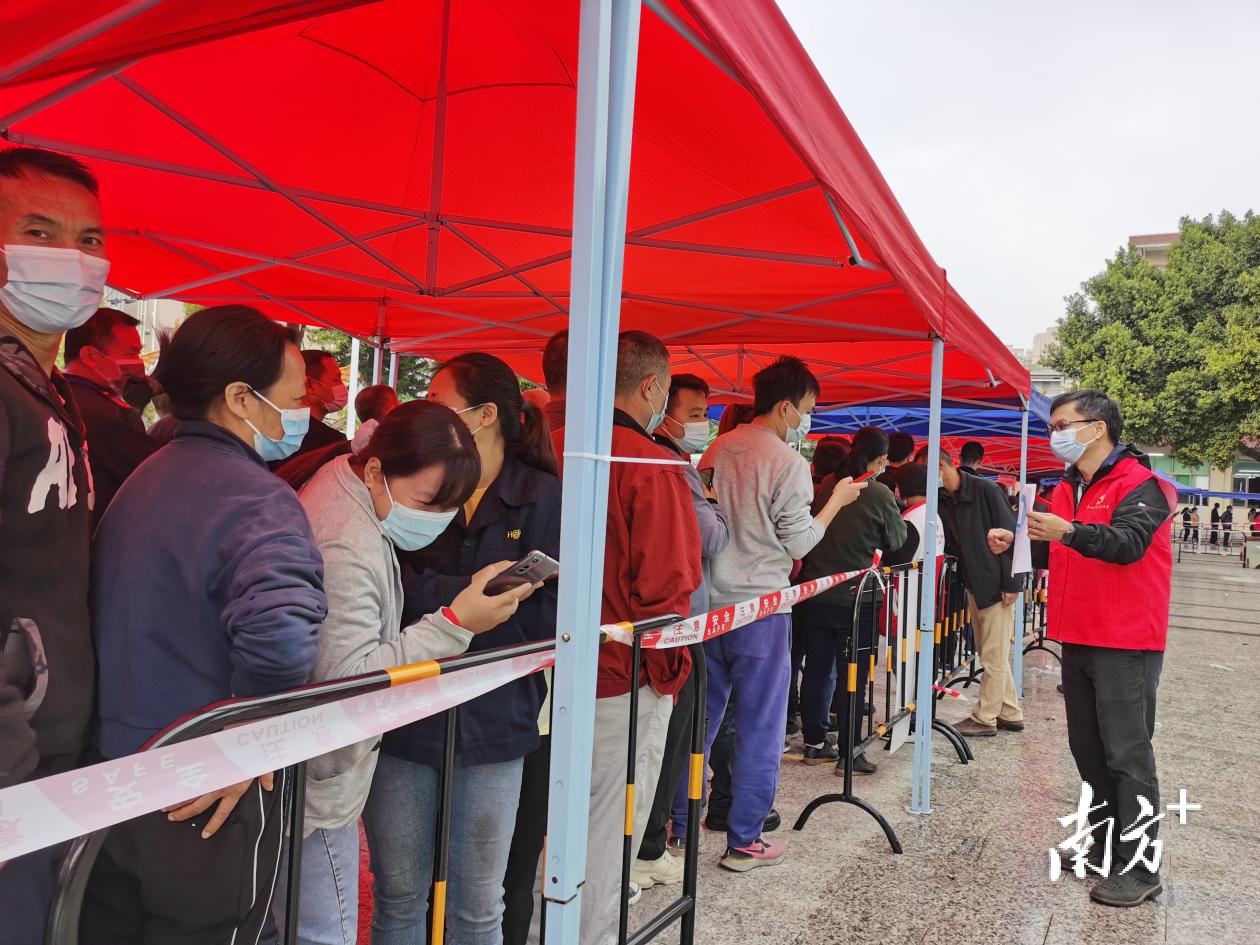 12月15日,在东莞茶山镇一个核酸检测点上,广东省特种设备检测研究院东莞检测院副院长蔡延彬和4位同事一起,为核酸检测做志愿服务。蔡延彬笑着说:“我是茶山镇的女婿,这次回来服务乡亲。”