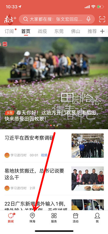 1.下载并打开南方+新闻客户端,在页面下方选择城市“珠海”,进入珠海要闻频道。