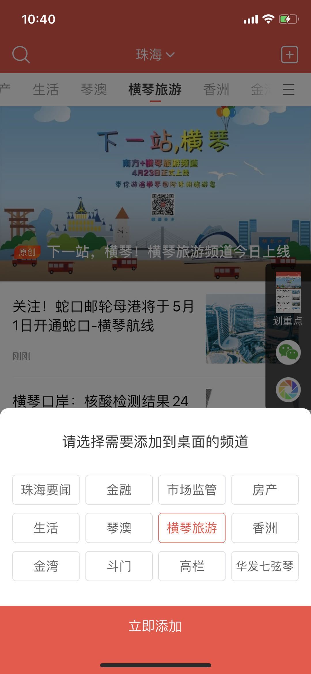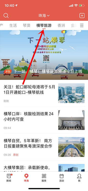 2、在频道栏目向左滑动,找到“横琴旅游”频道,点击即可进入页面。