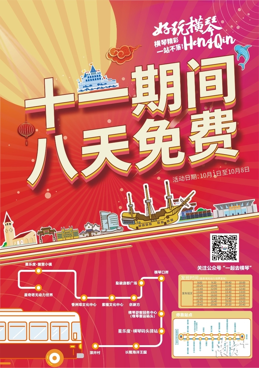 “十一”黄金周即将到来。近日,记者从珠海大横琴泛旅游发展有限公司获悉,10月1日至10月8日期间,游客可免费乘坐“好玩横琴”公交旅游巴士,此举旨在全力促进横琴旅游市场恢复,在黄金周期间为来横琴旅客提供交通便利。