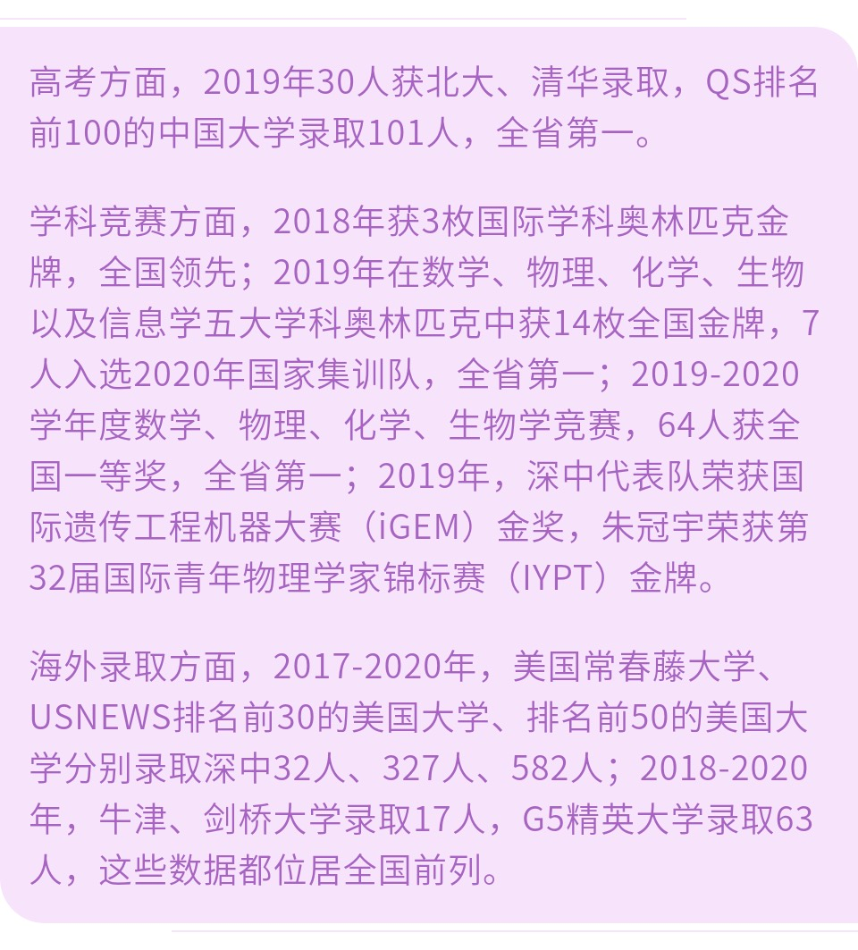 截至目前,深中2020届高三有5人获北大、清华保送,1人被清华丘成桐数学英才班预录取,10人获得北大、清华“强基计划”破格入围,人数位列广东省第一。