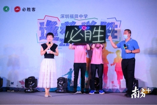 当天第一节晚自习下课之后,福田中学高三的学生被班主任叫到着着灯的体育场,正当学生们感到疑惑时,全场“福中必胜”“人人都是必胜客”“锦鲤本鲤,逢考必胜”的灯牌突然亮起,同学们倍感惊喜。